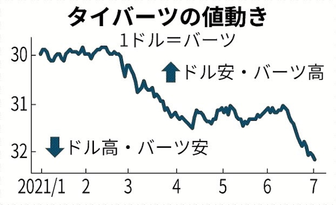 バーツ安について7月7日に最初に投稿しましたが、その後、7月末現在もバーツ安が続いています。デルタ株で感染拡大が急増していることがその背景と思われます。こちらのThe Nation記事をご参照ください。