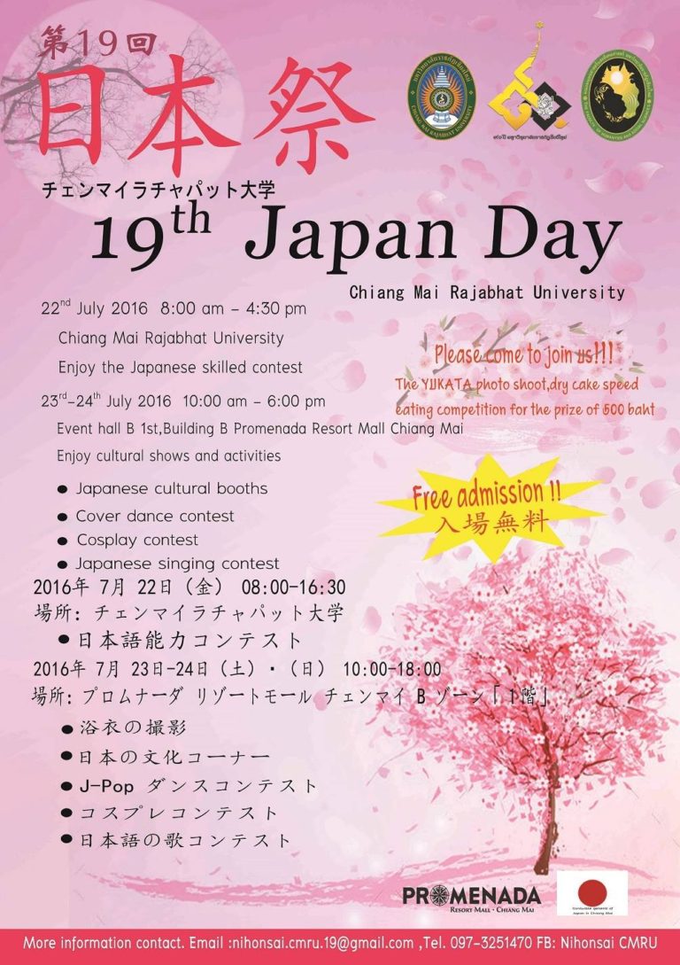 祭りやイベント第19回チェンマイ・ラチャパット大学日本祭開催のお知らせ日本国総領事館からの「日本祭り」のお知…共有: Facebook で共有するにはクリックしてください (新しいウィンドウで開きます) Facebook クリックして X で共有 (新しいウィンドウで開きます) X fujimoto2016年7月13日